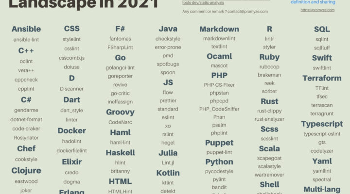 Infographic – Open source linters, tools for code analysis – 2021 Tools for code analysis are commonly called linters. A linter is a program dedicated to automatically identify code smells, bugs, vulnerabilities,